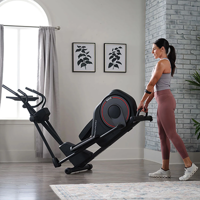 Libere espacio después de su entrenamiento rodando su máquina con las ruedas de transporte montadas en la parte delantera.
